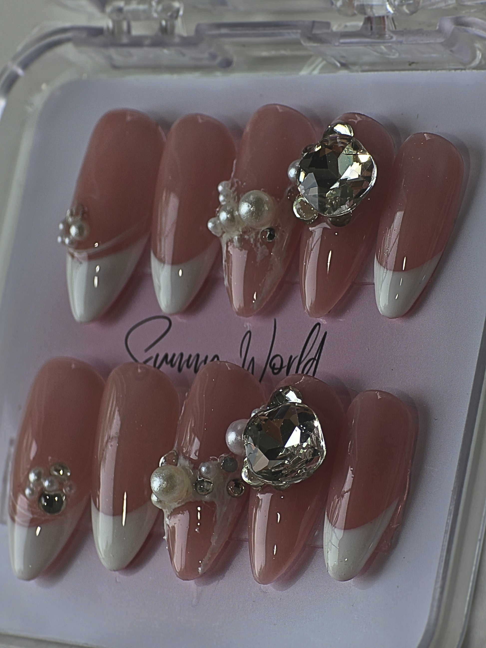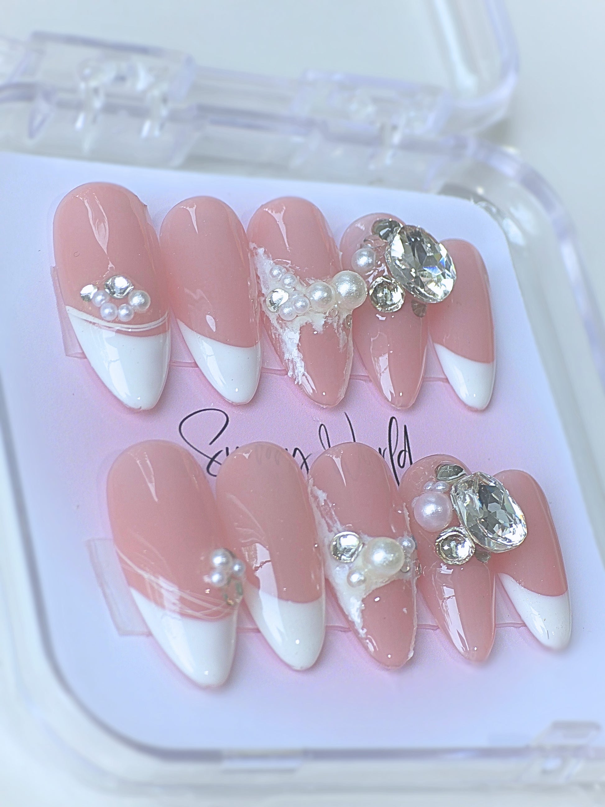 Bridal nails, in Medium almond shape, represent commitment and love. The diamond crystal on the ring finger adds an elegant touch for those who are recently engaged or married. Express your joy and love with Bridal nails.