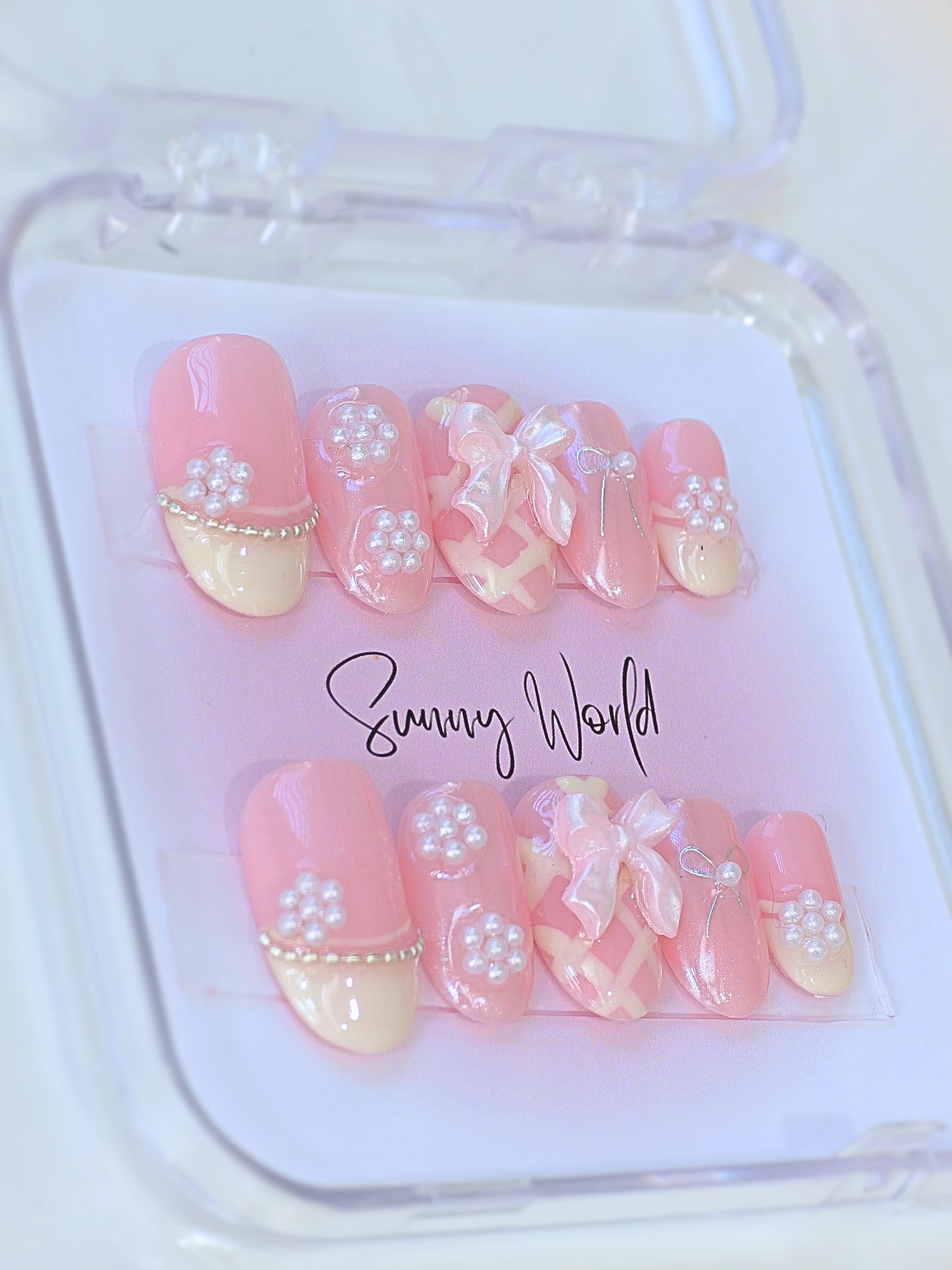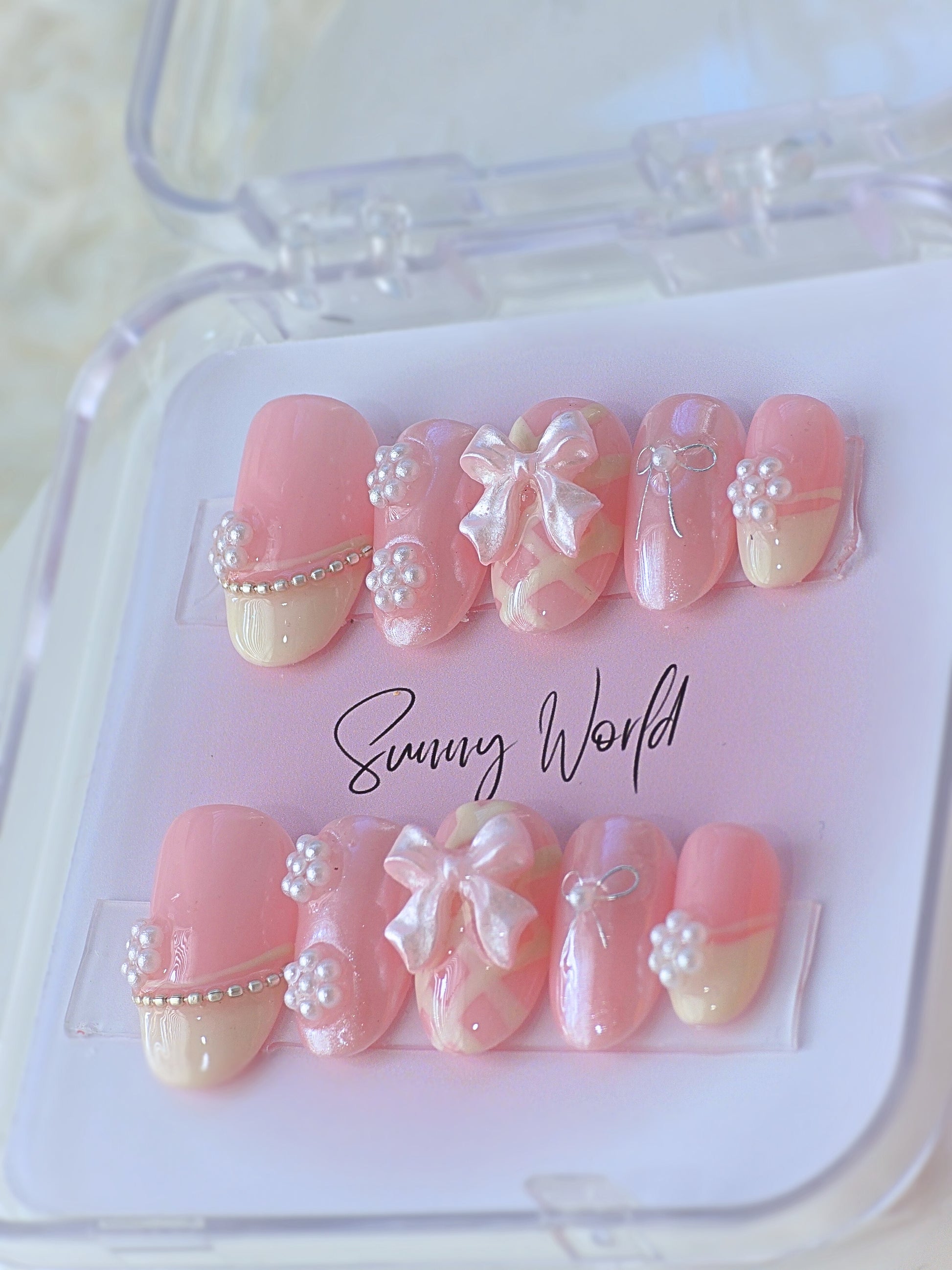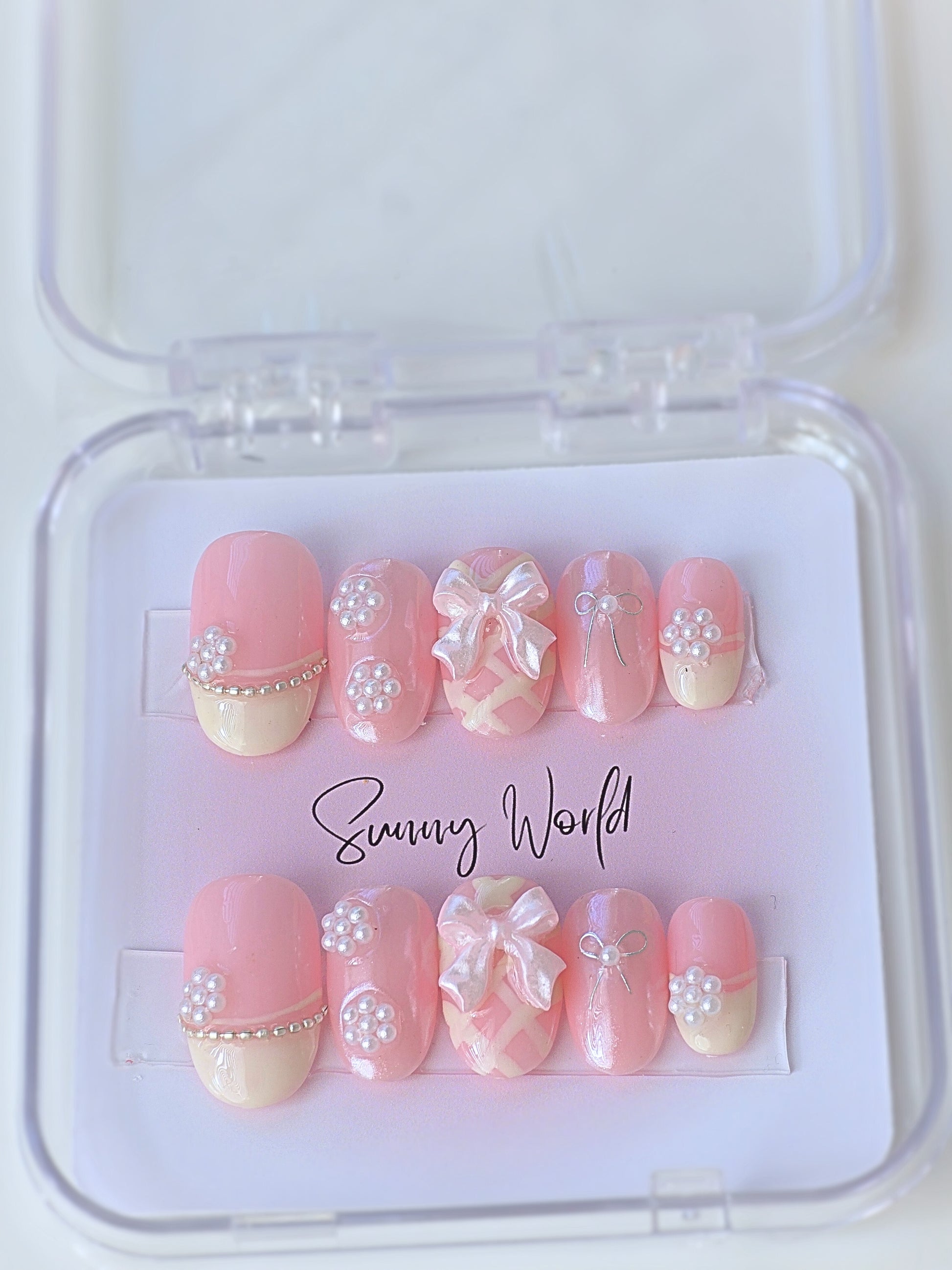 Daisy is the perfect addition to your nail collection. Featuring a short round nail shape, pearl daisy and light yellow polish, and the cutest shiny pink bow, you'll love the salon-quality look and feel. Plus, it's reusable, making it an eco-friendly choice.
