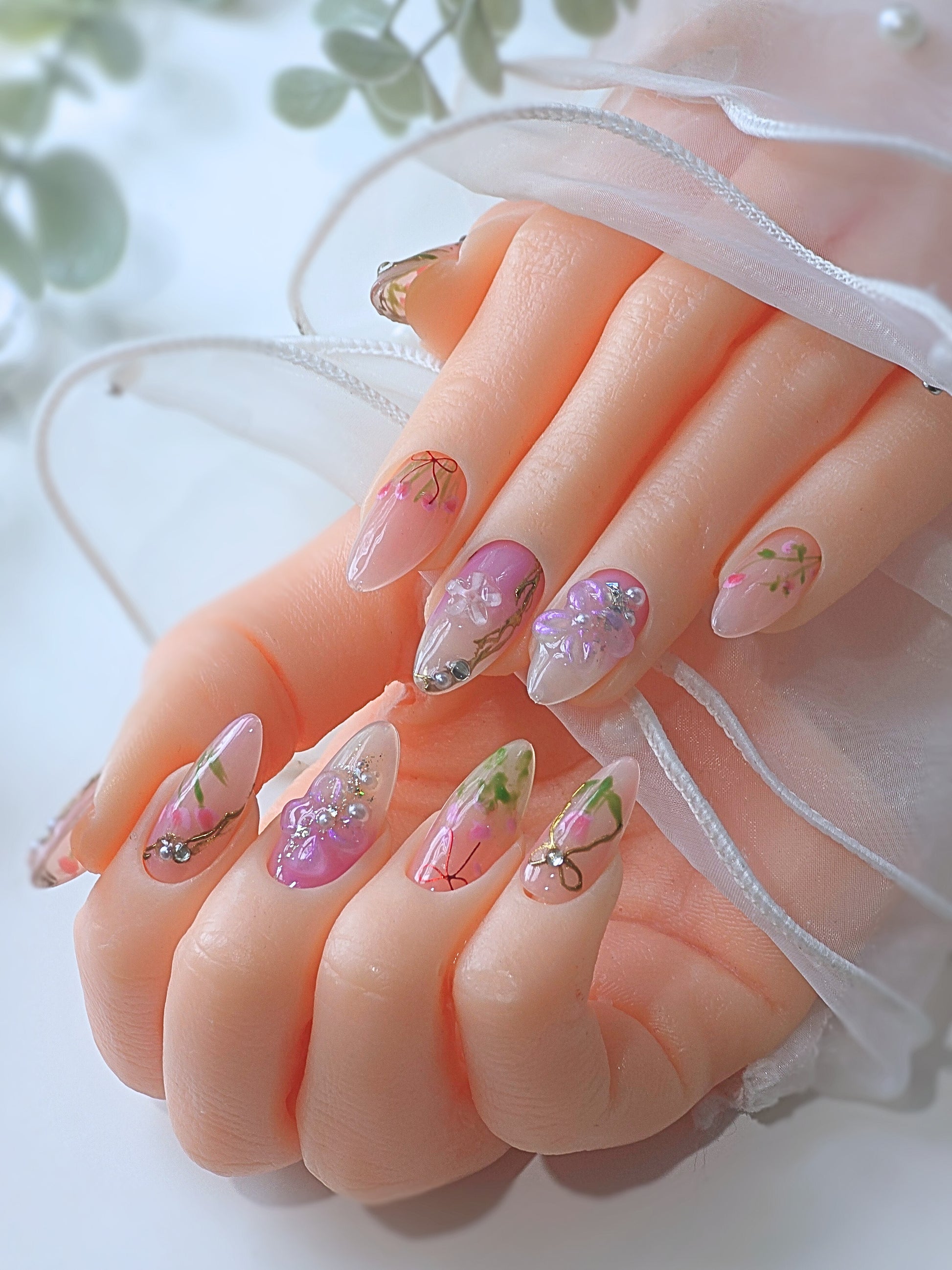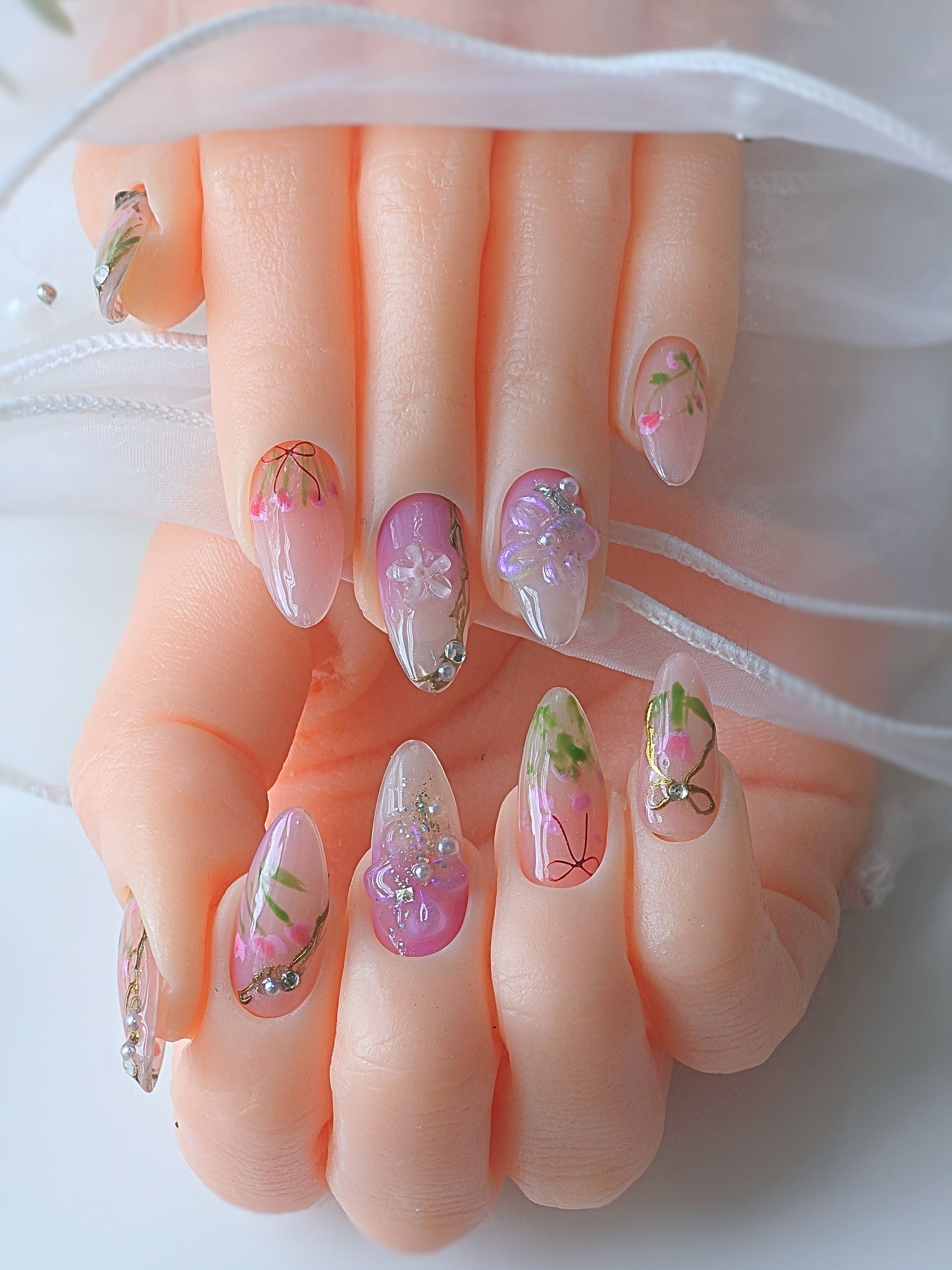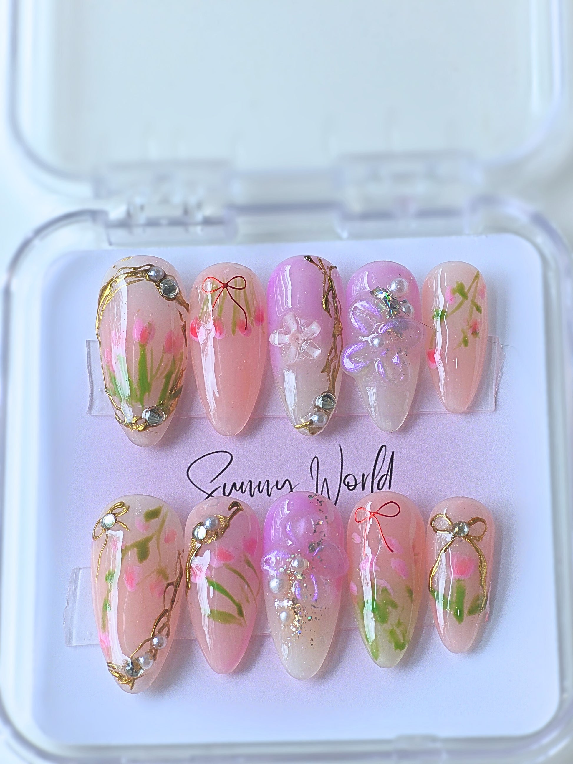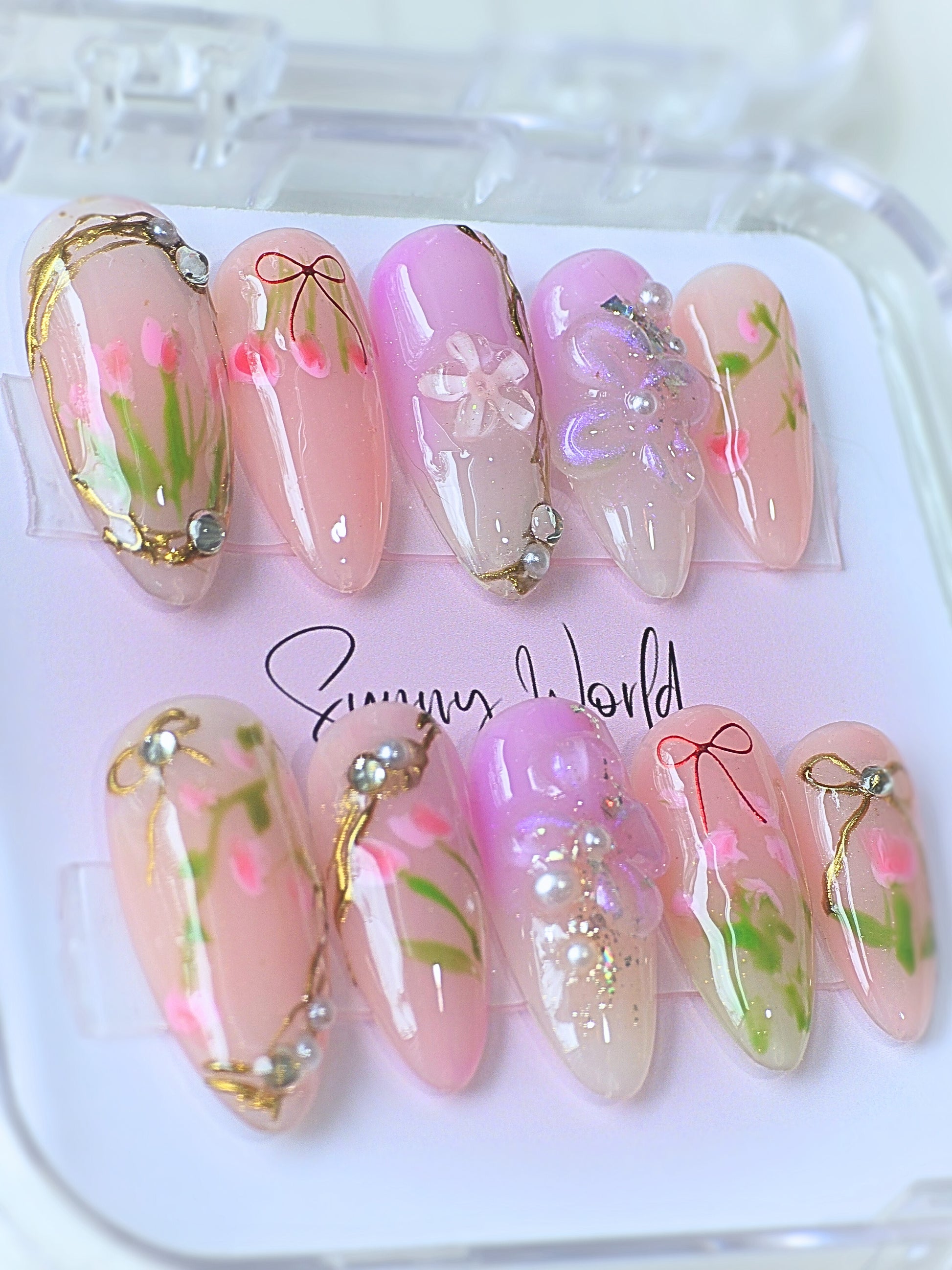 Enchanted is a medium almond nail shape with a magical vibe, hand-drawn tulip flowers, and shimmering clear flower sculptures. The golden vines add a touch of enchantment to create a truly magical feeling. Made with Solan quality, this product will elevate your nail game to the next level.