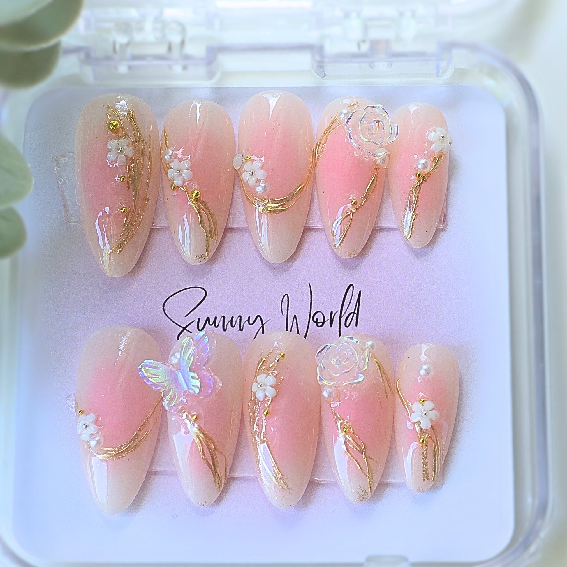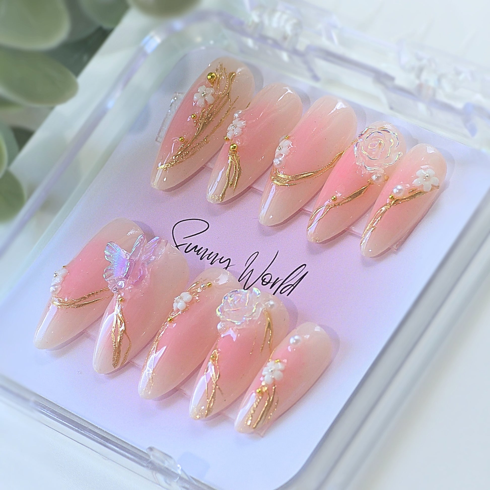 Fairyland nails offer a touch of elegance and magic with medium almond press nails, adorned with butterfly and rose charms. The gold vines create a majestic feel, while their sturdy and high quality design ensures long-lasting beauty for your nails. Perfect for any occasion where a touch of whimsy is needed.