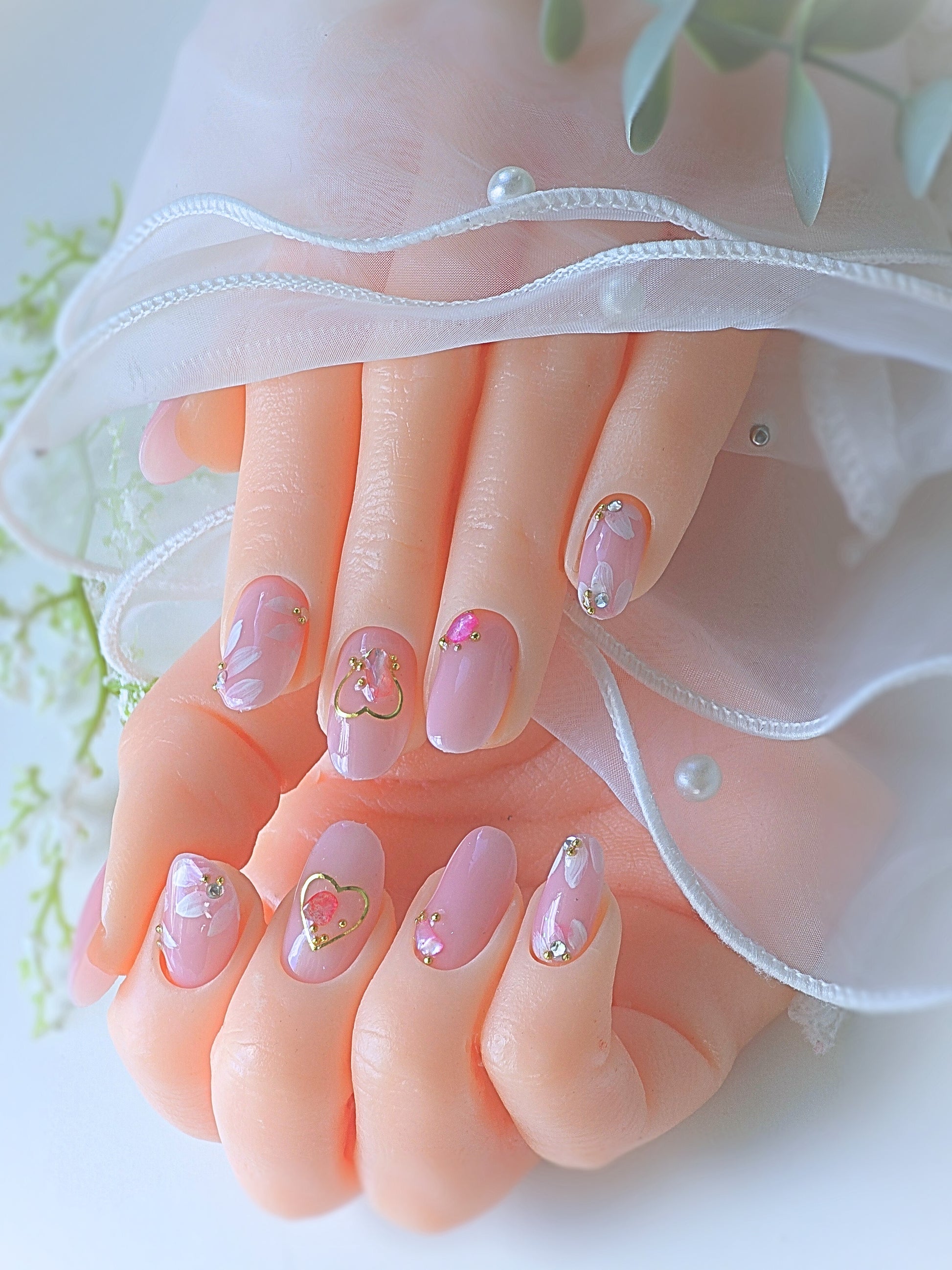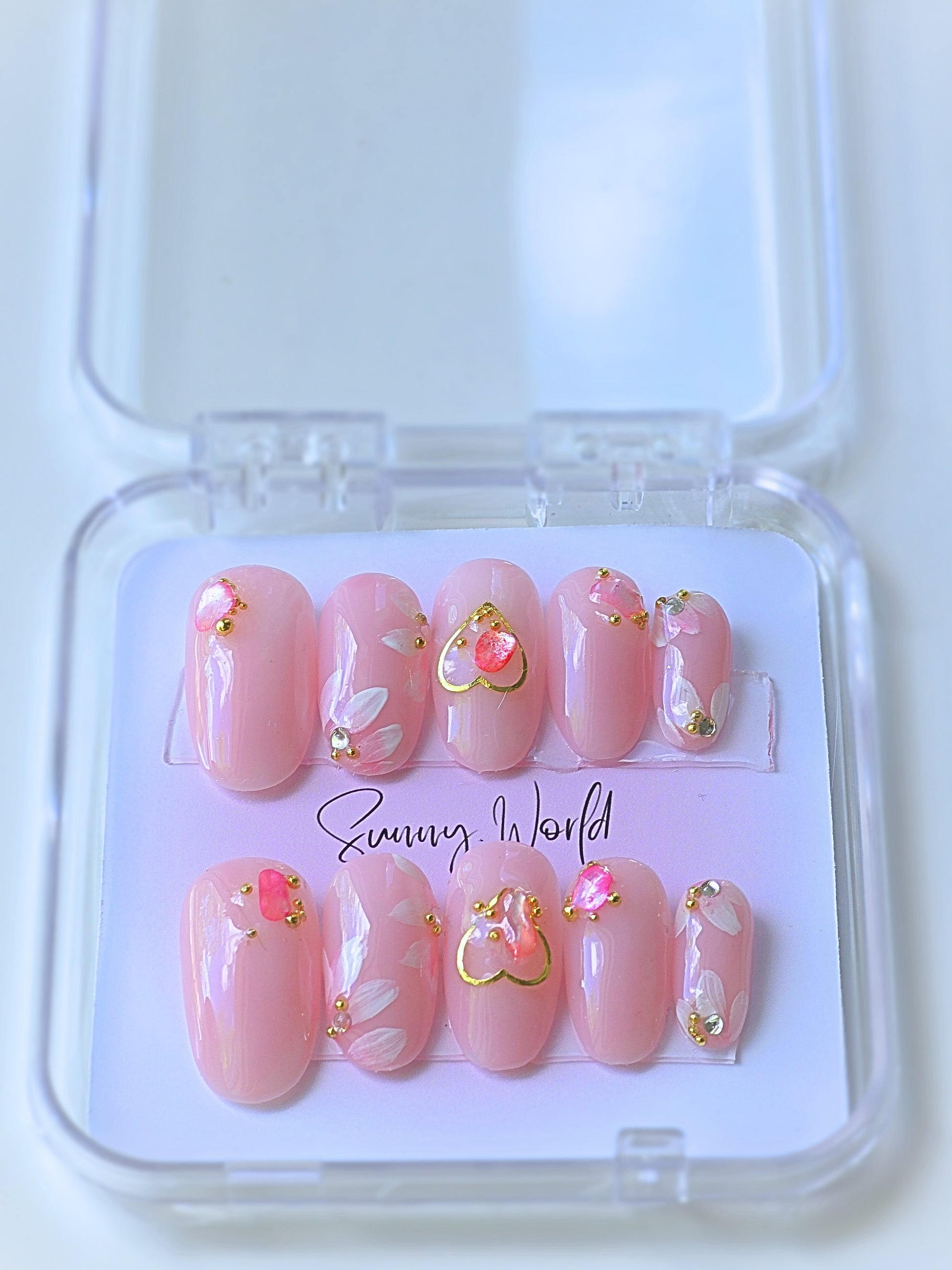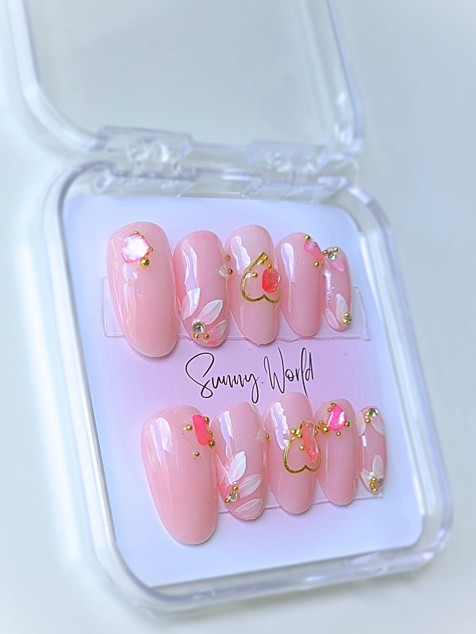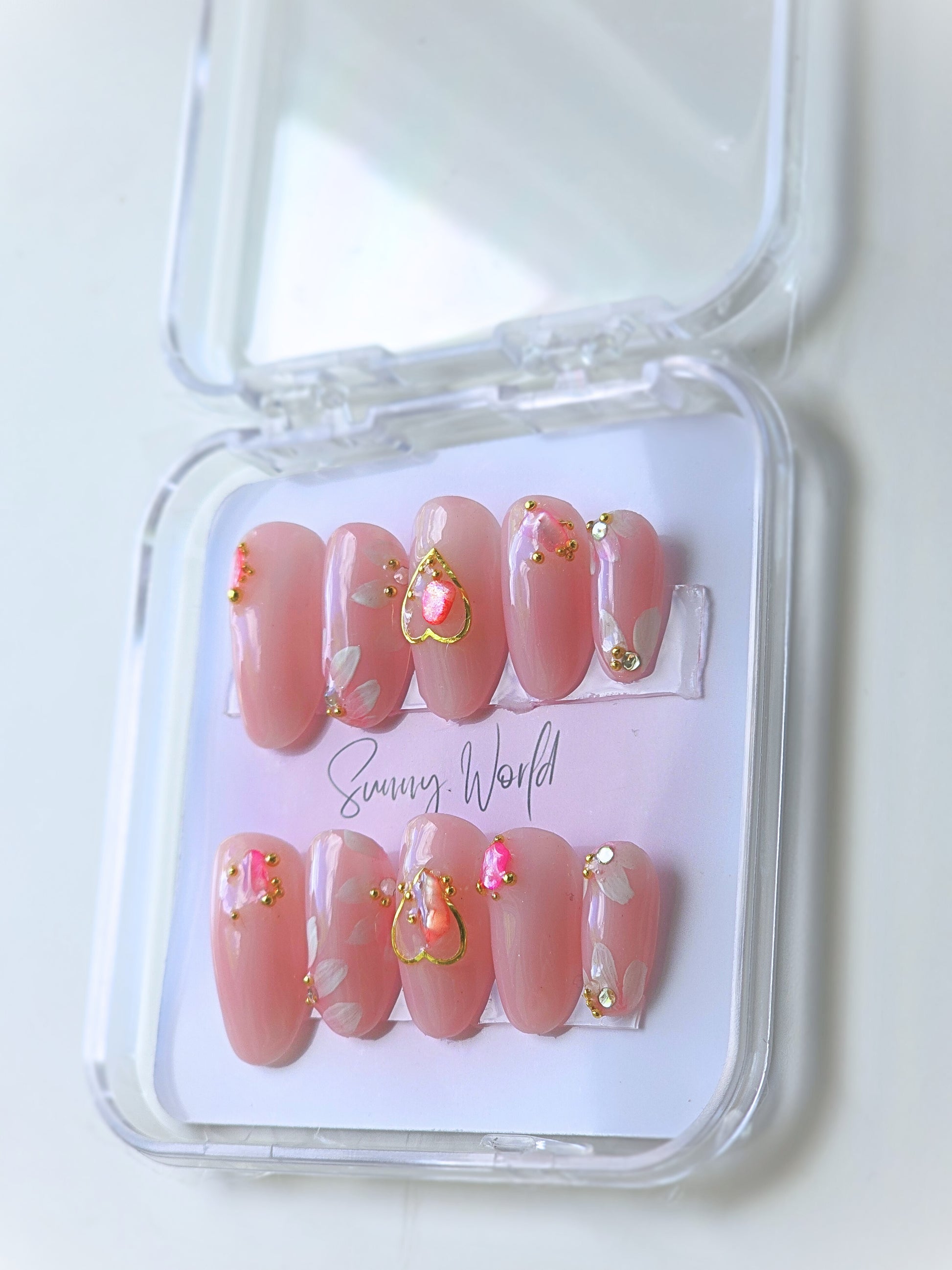 First Love is a luxurious set of medium round nails meant to represent the feeling of love at first sight. With delicate hand-drawn flowers, sparkling pink crystals, and sparkling gems, these nails bring to mind the innocence and excitement of falling in love. Treat yourself to this beautiful set and feel the magic of First Love.