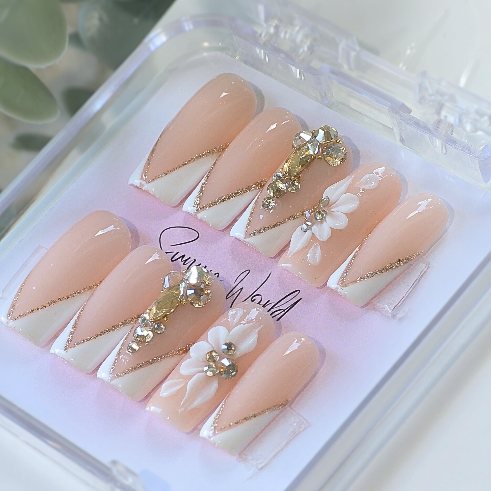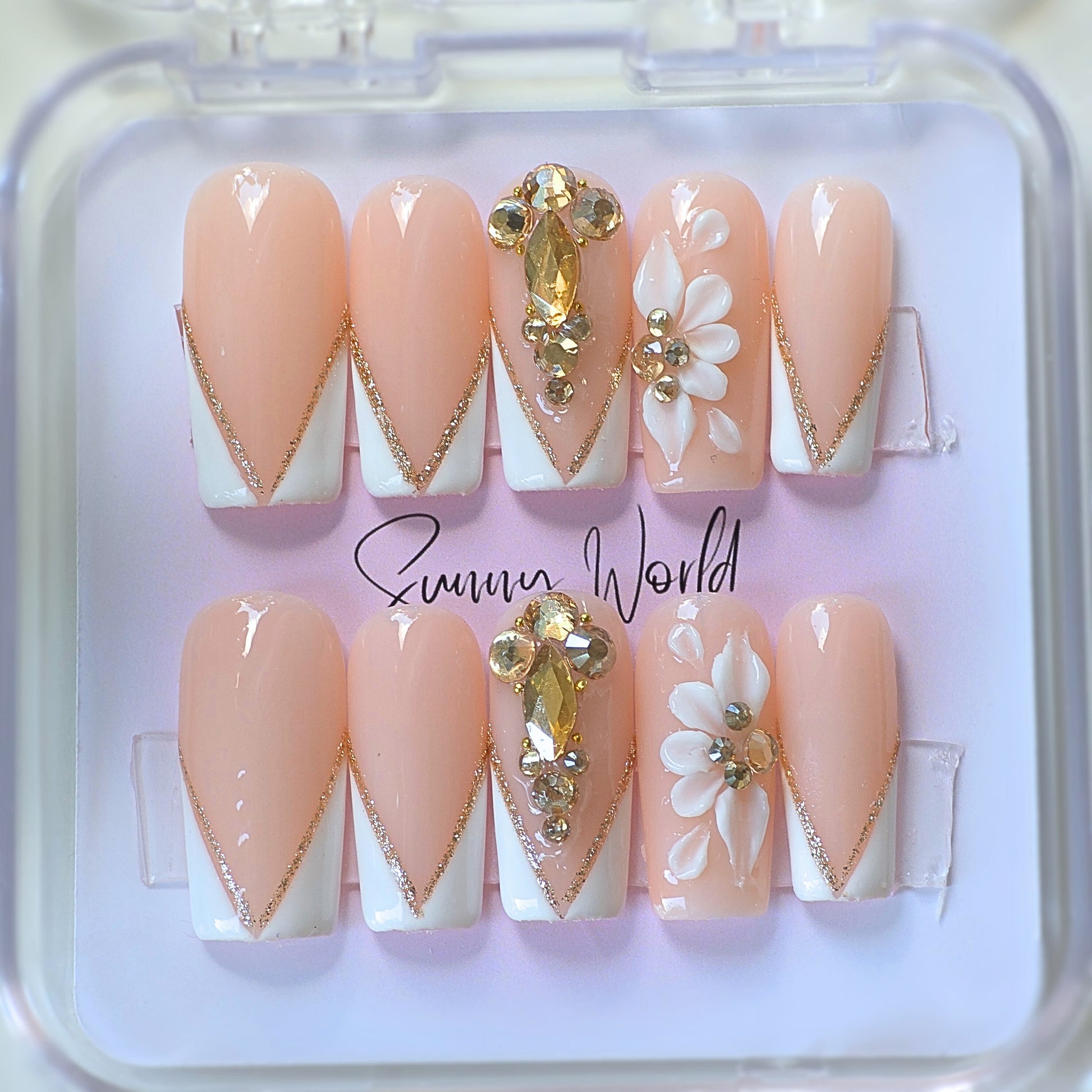 The Gold Empress nail design features a long square press with a touch of elegance and luxury. These high quality nails are adorned with diamond gems and completed with a French tip with gold lining freestyle, providing a sturdy and sophisticated finish.