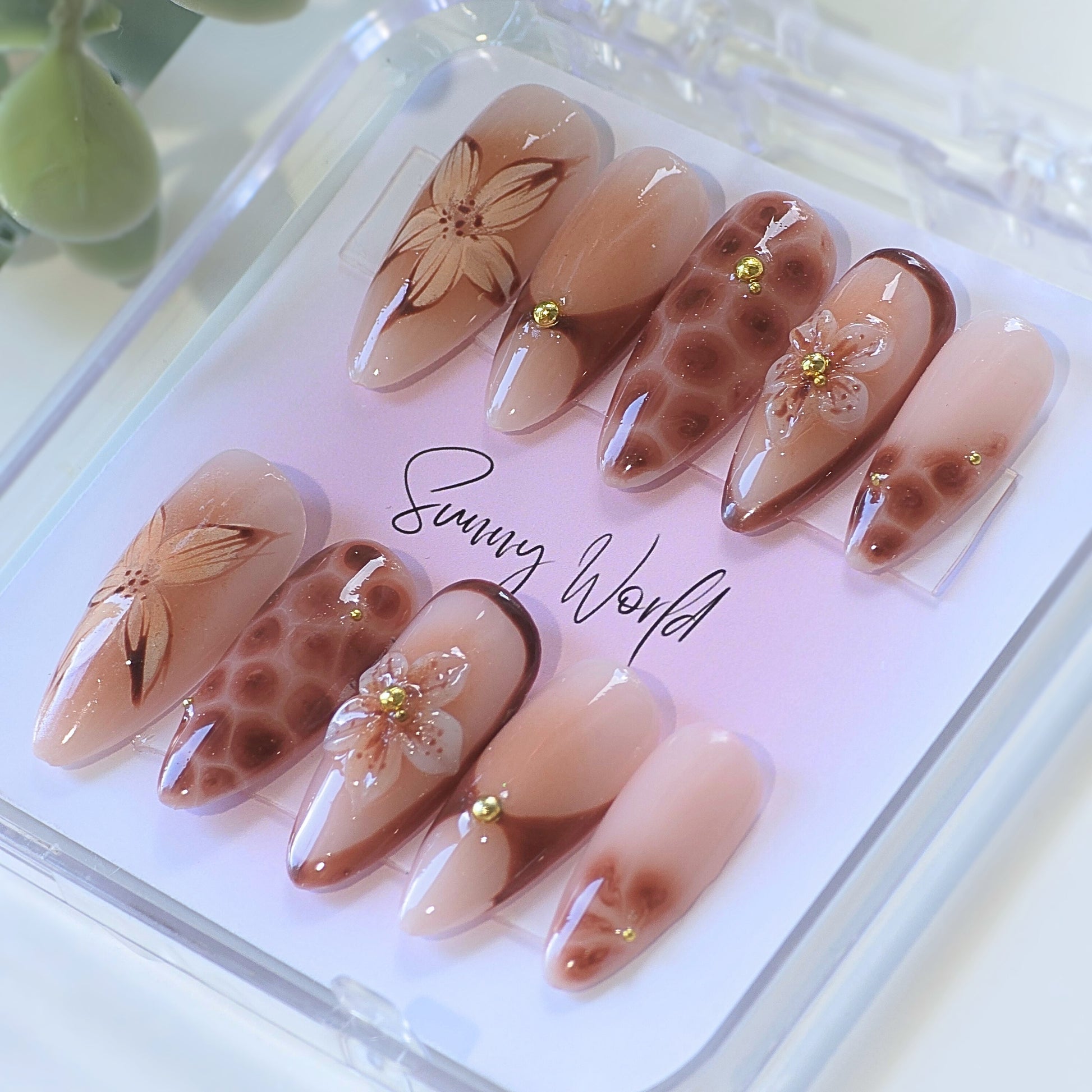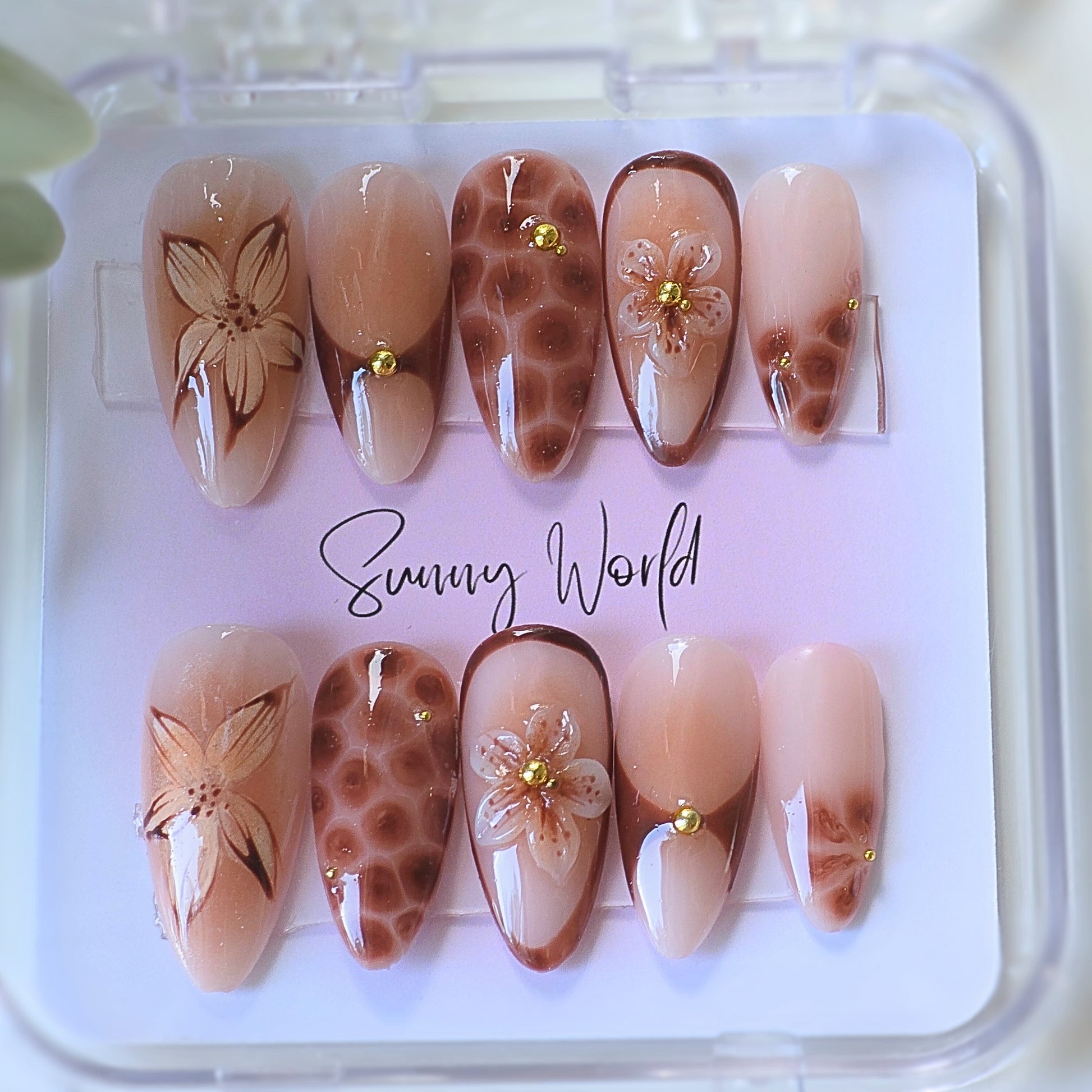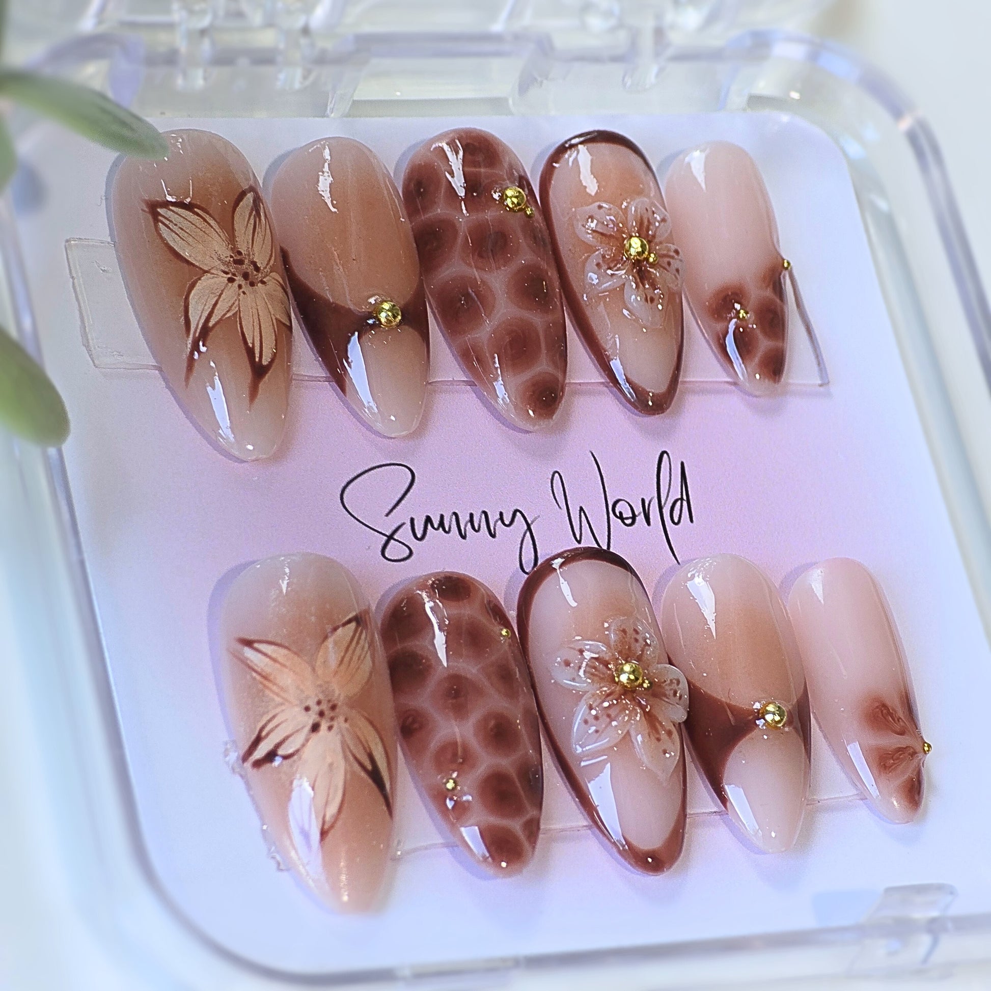 Gorgeous nails with a medium almond shape and trendy brown leopard print and flower design. The unique freestyle by the shop and high-quality materials make for a wicked and stylish set that can be reused. Elevate your look with these beautiful and lasting nails.