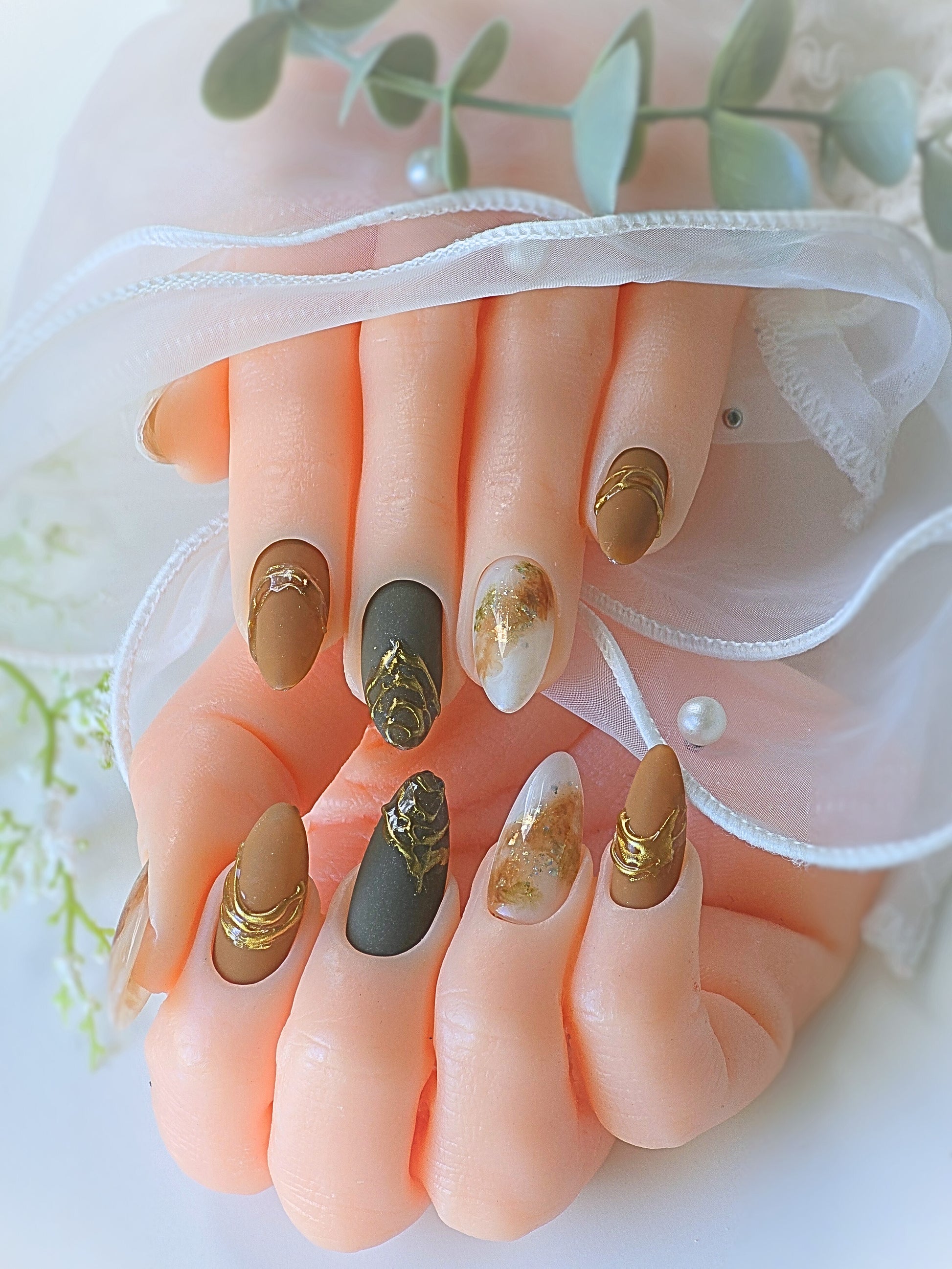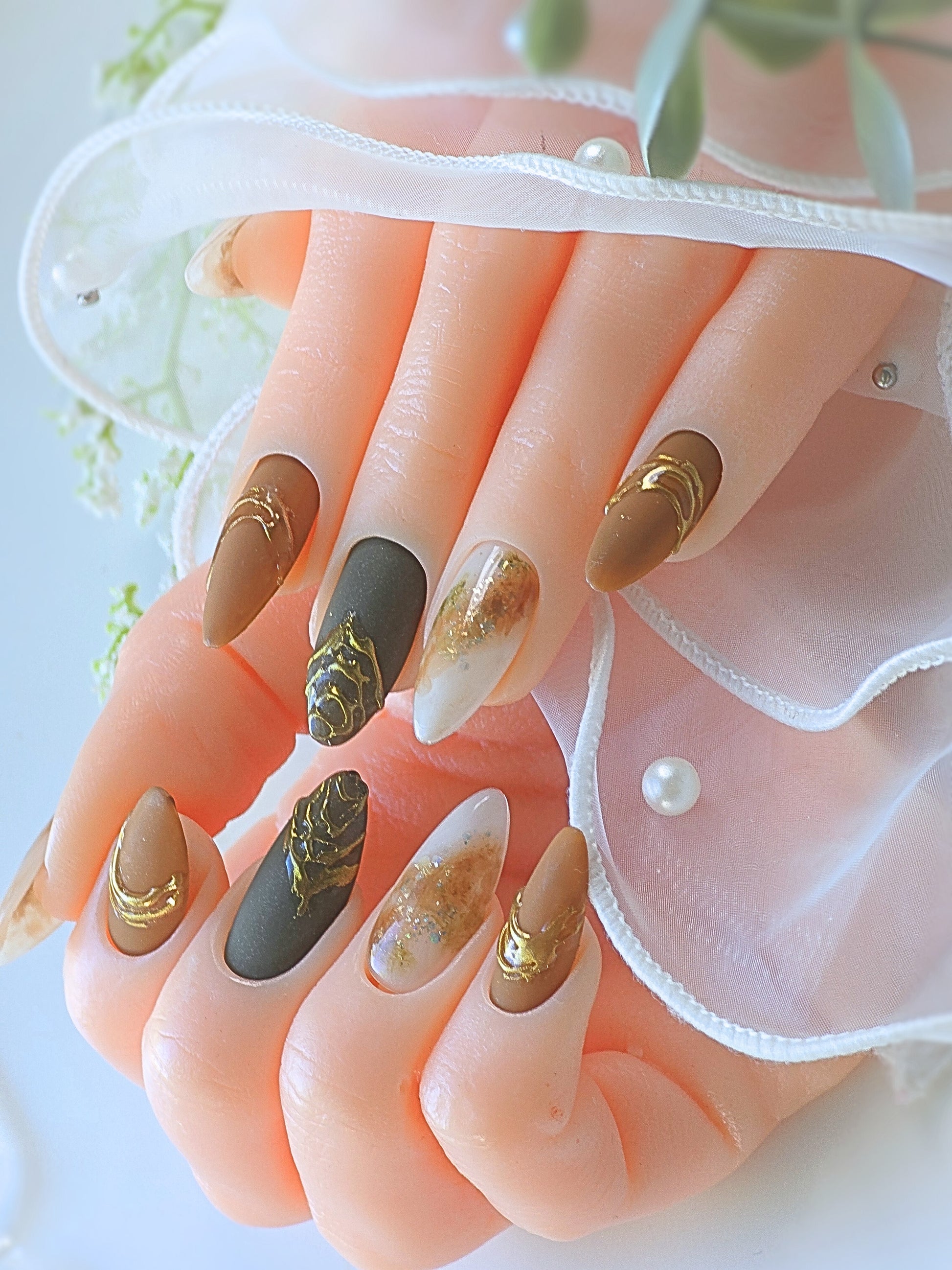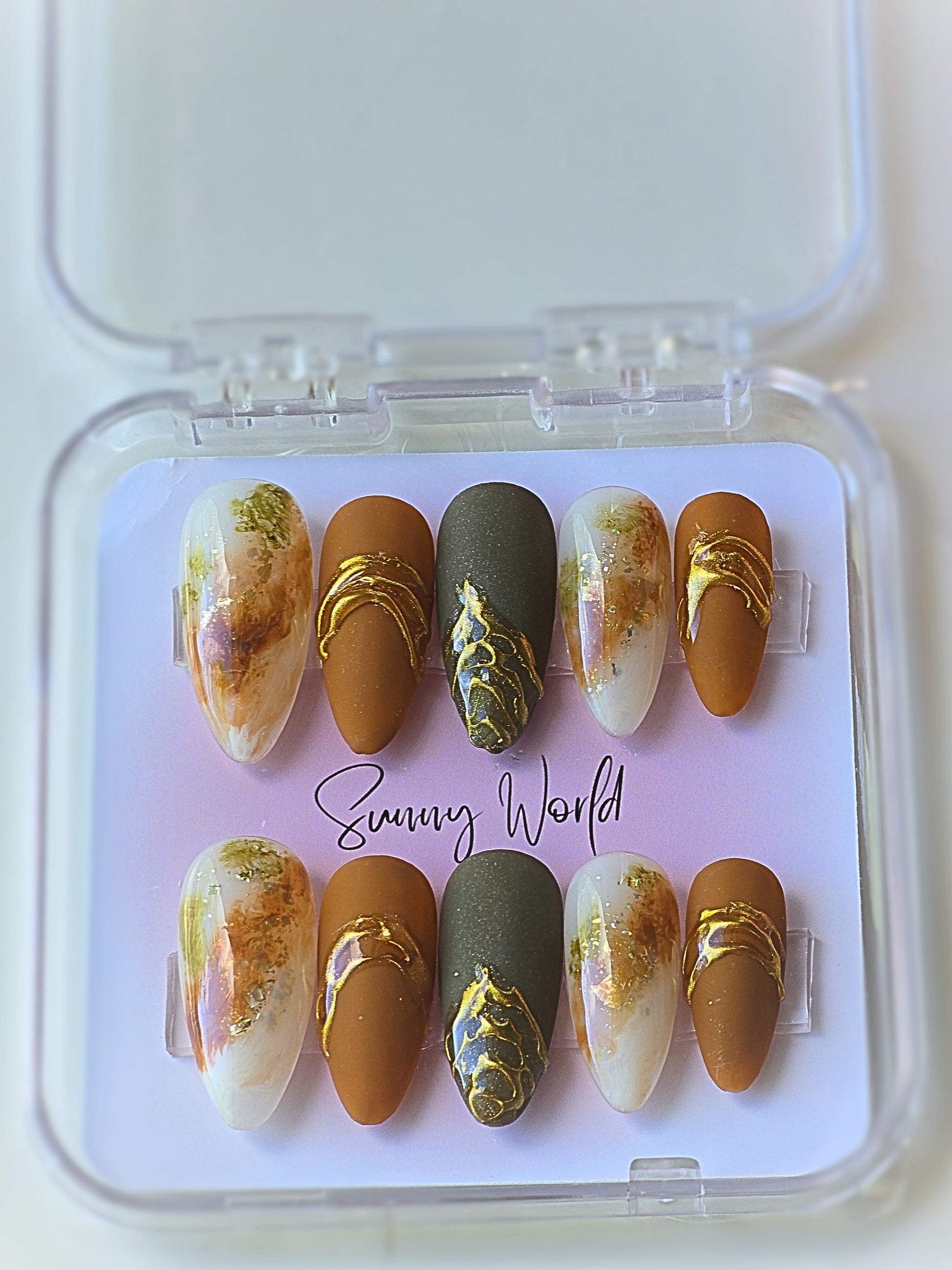 Hazel is the perfect addition to your collection with its medium almond press on shape and stunning Flaming gold chrome and brown jade design. Its mix of matte and gloss top creates a simple yet beautiful look. Upgrade your style today with Hazel.