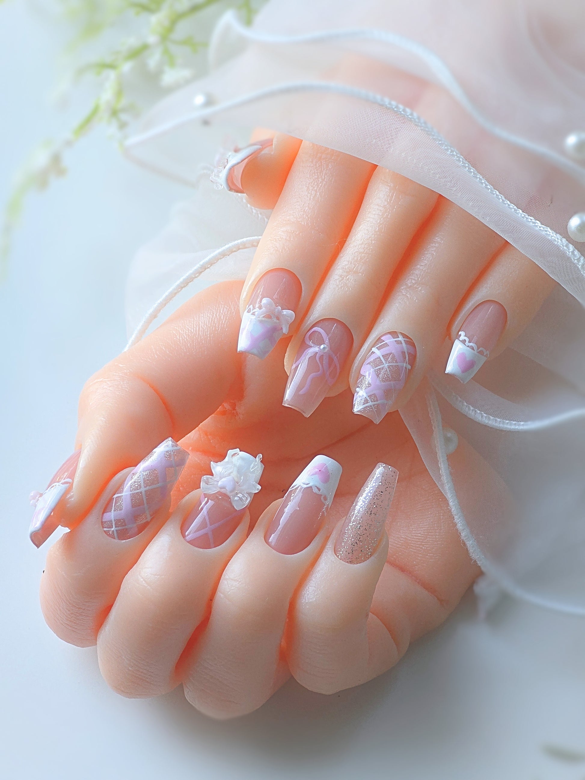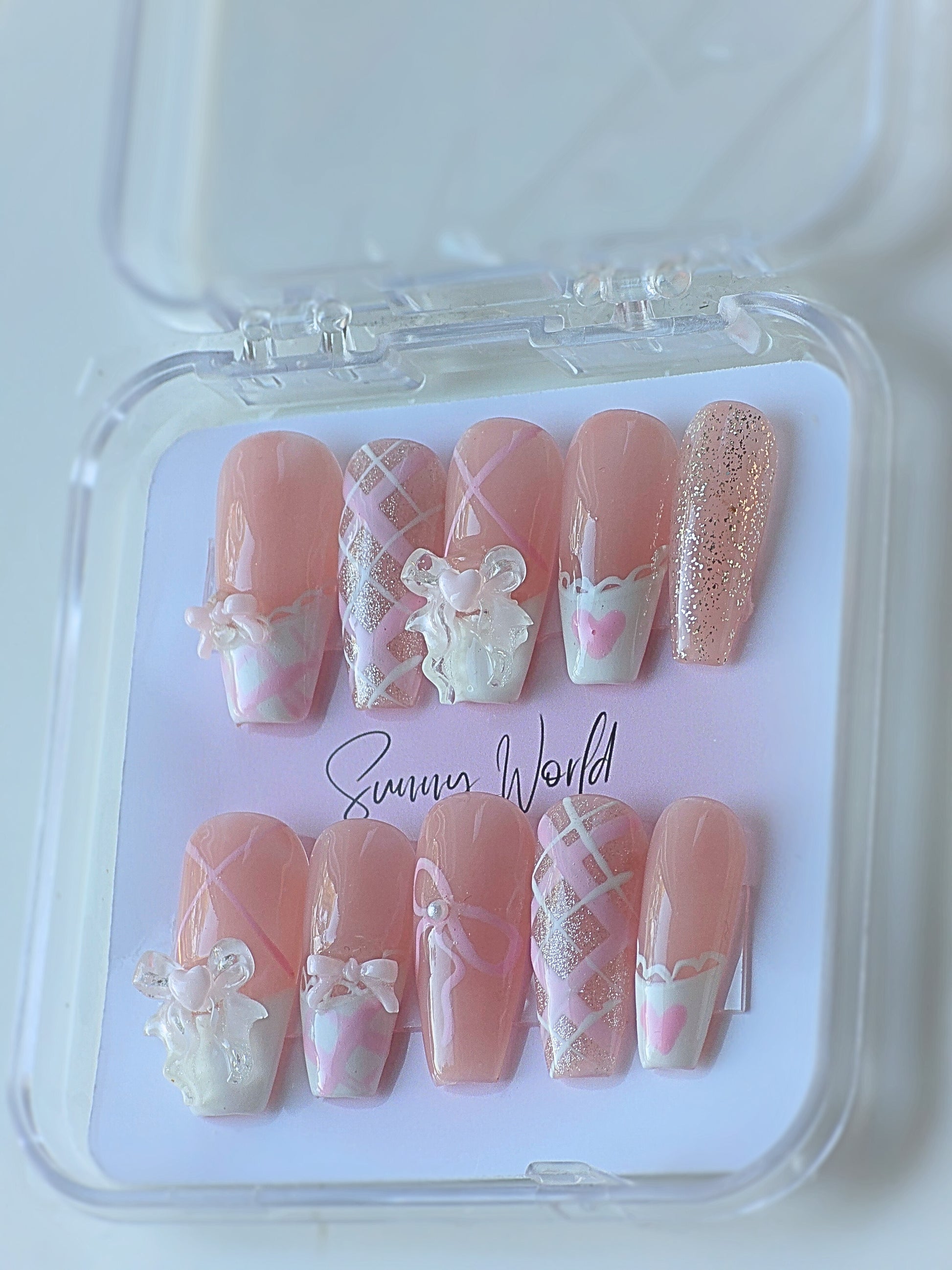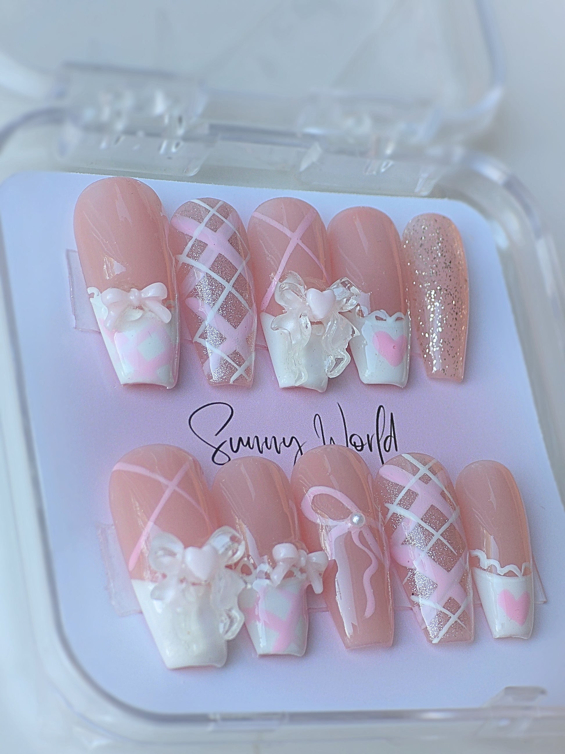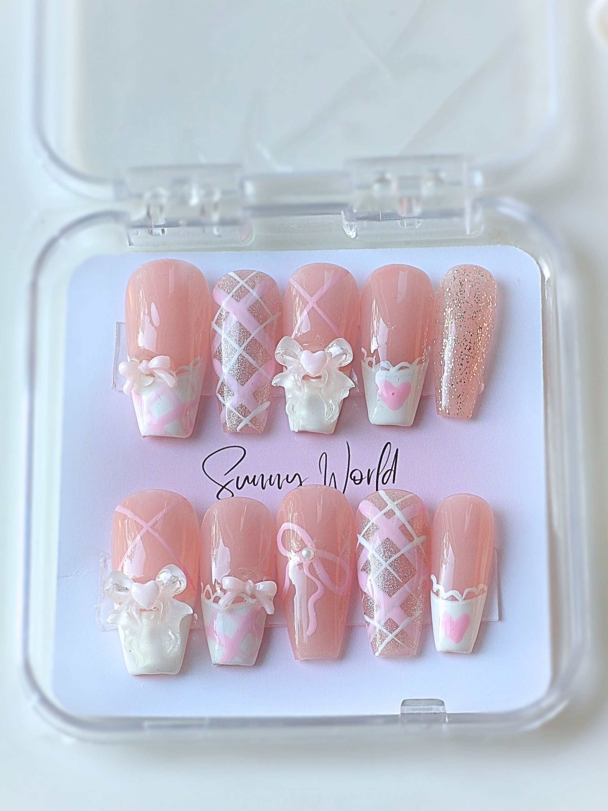 Jenny is a stylish and durable press on inspired by Jenny from BlackPink. Handmade with high quality gel, each nail features unique hand paint art and gel bows for a cute touch. Reusable for long-lasting use.