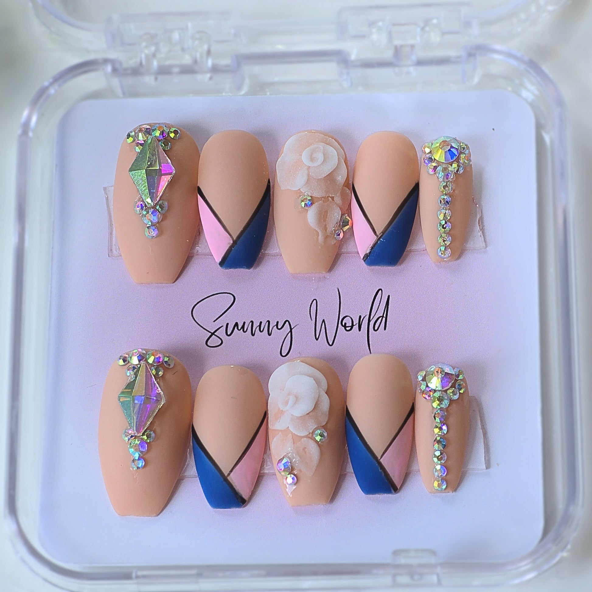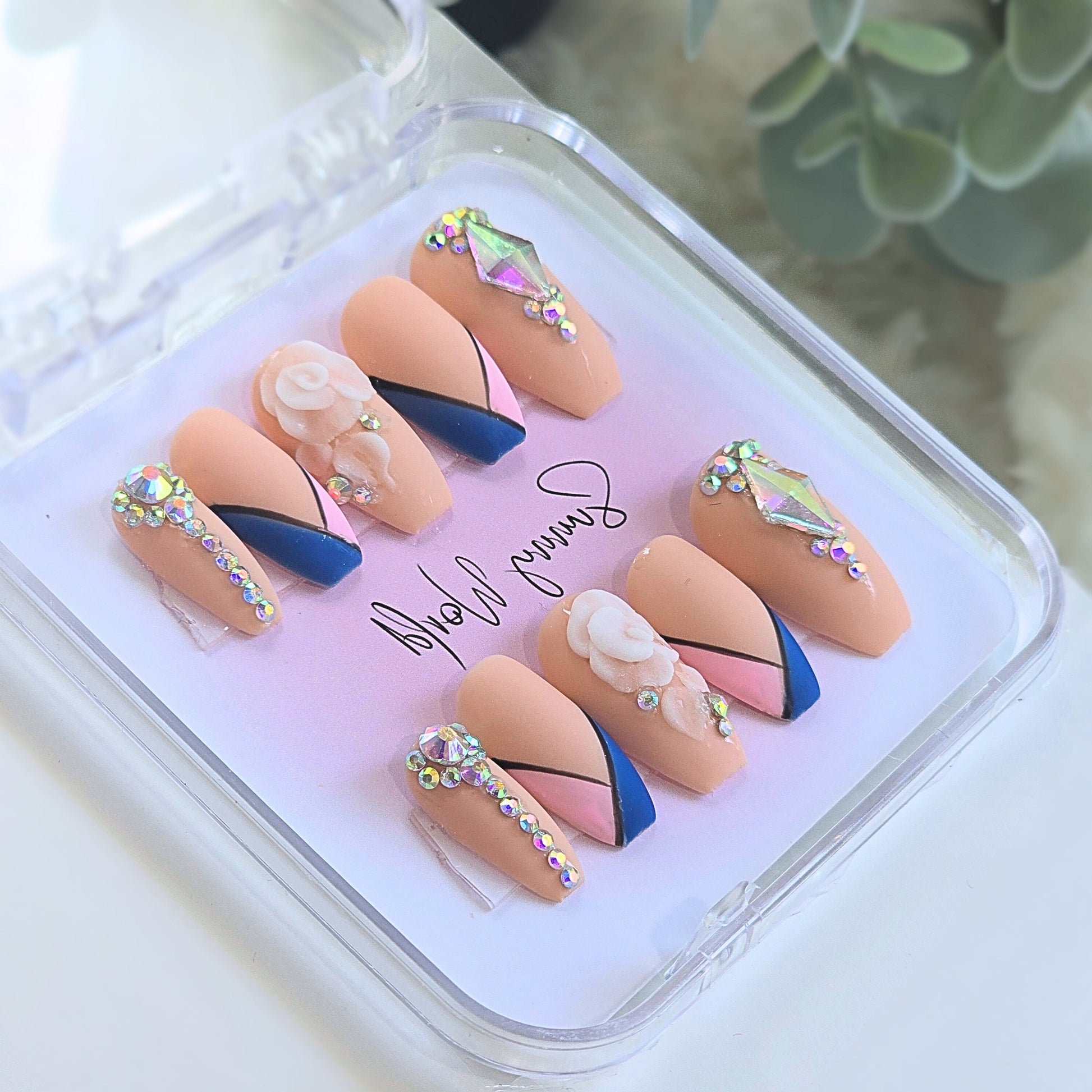 Mia is the perfect combination of style and quality. With a short coffin press nail, each hand-drawn design is accented with luxury gem diamonds for a truly unique look. It is a matte coating. Each piece is carefully handmade, ensuring a sturdy and long-lasting product. Elevate your manicure game with Mia.