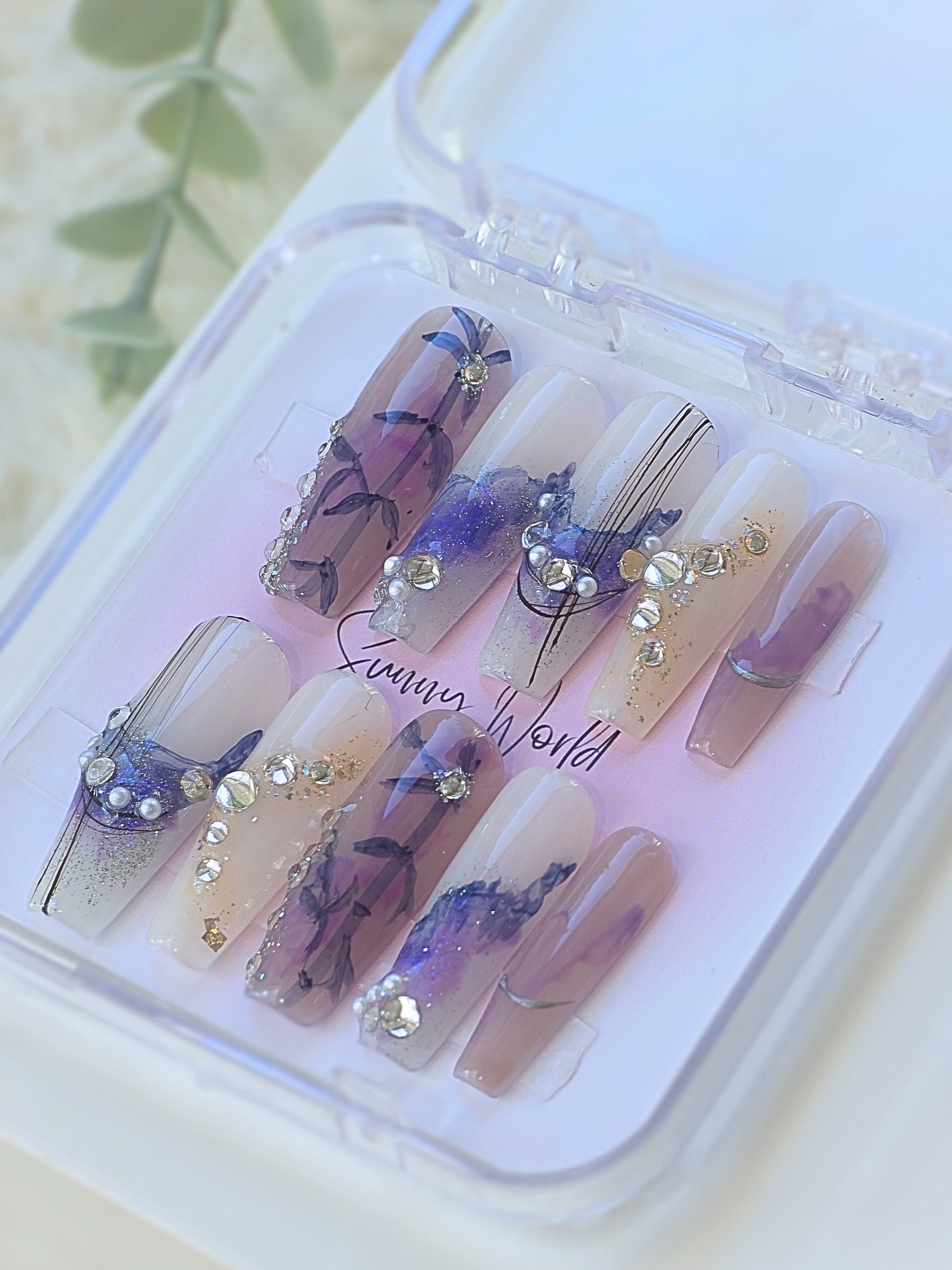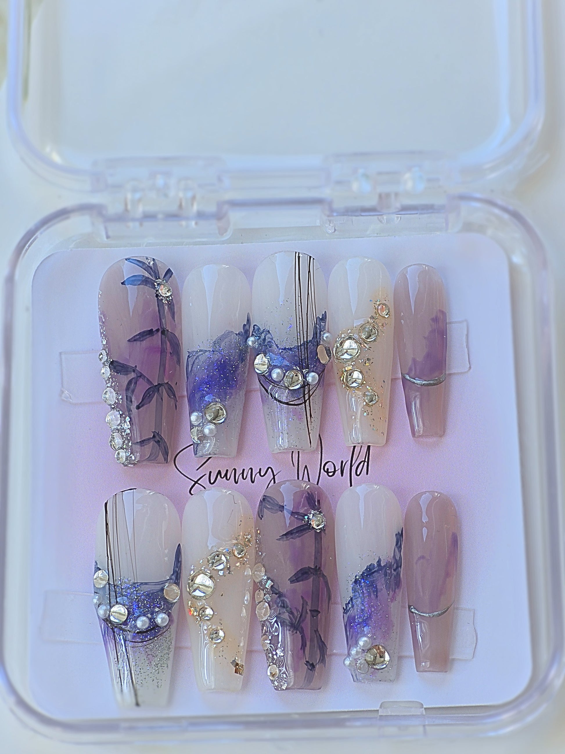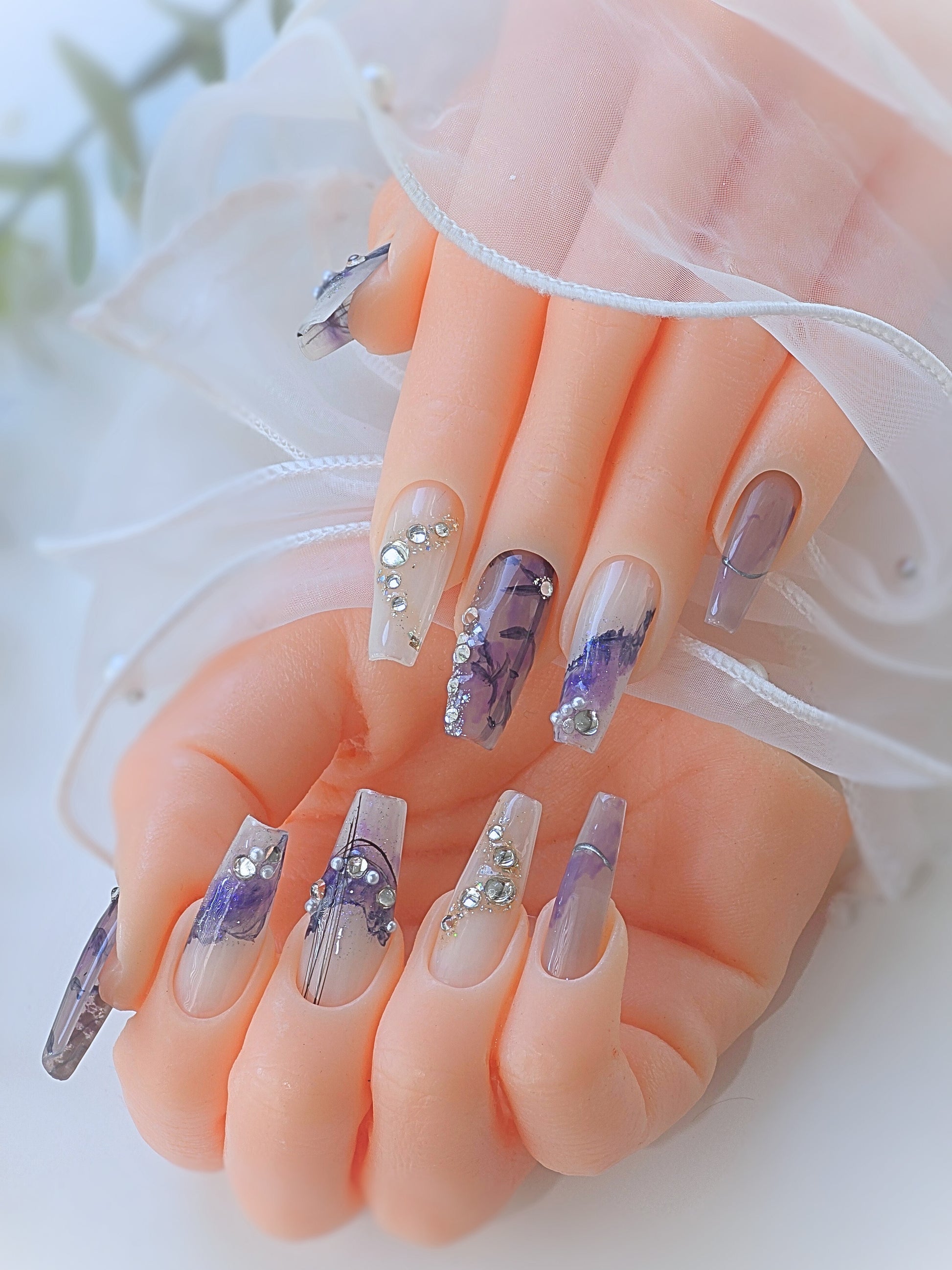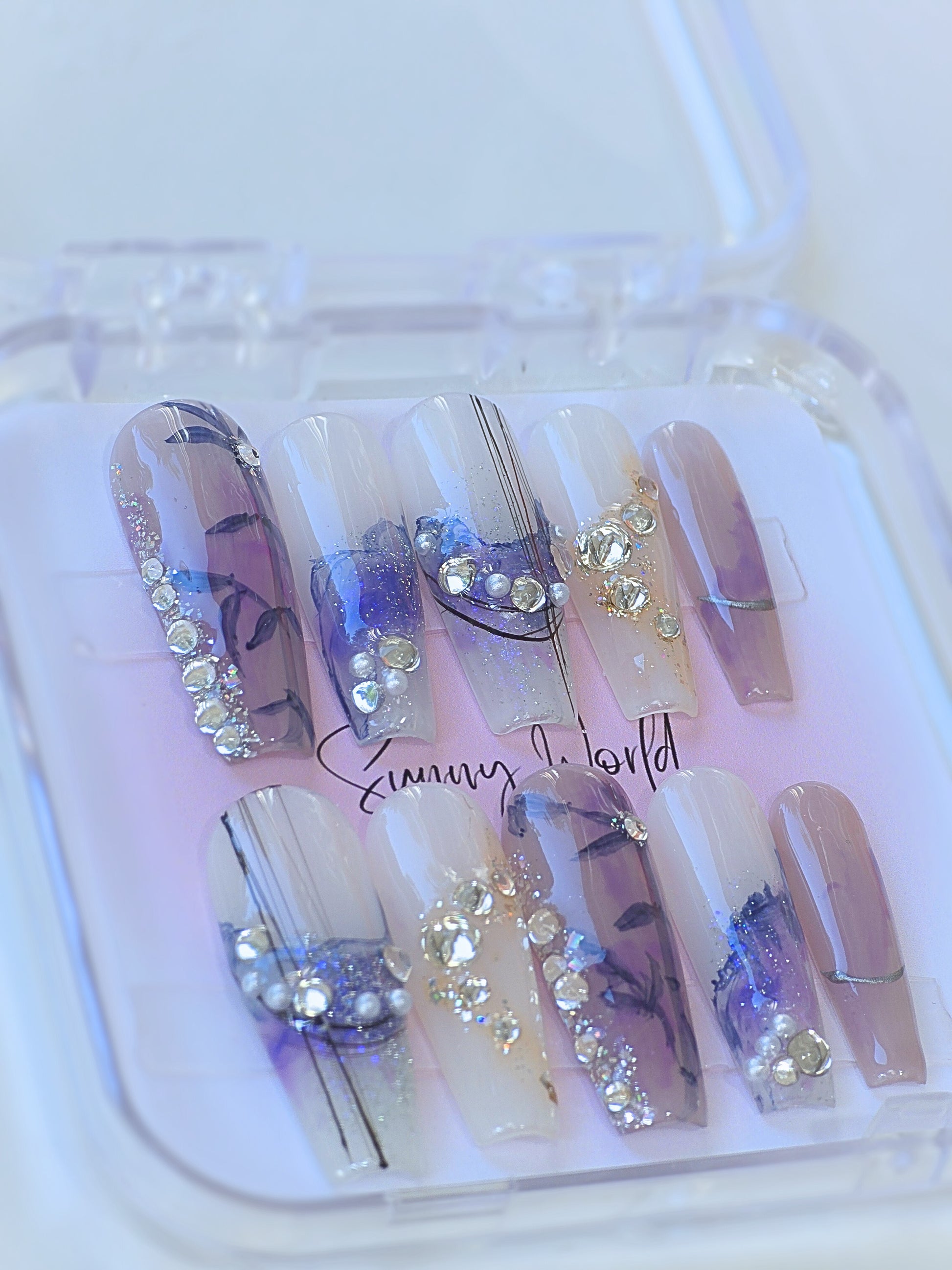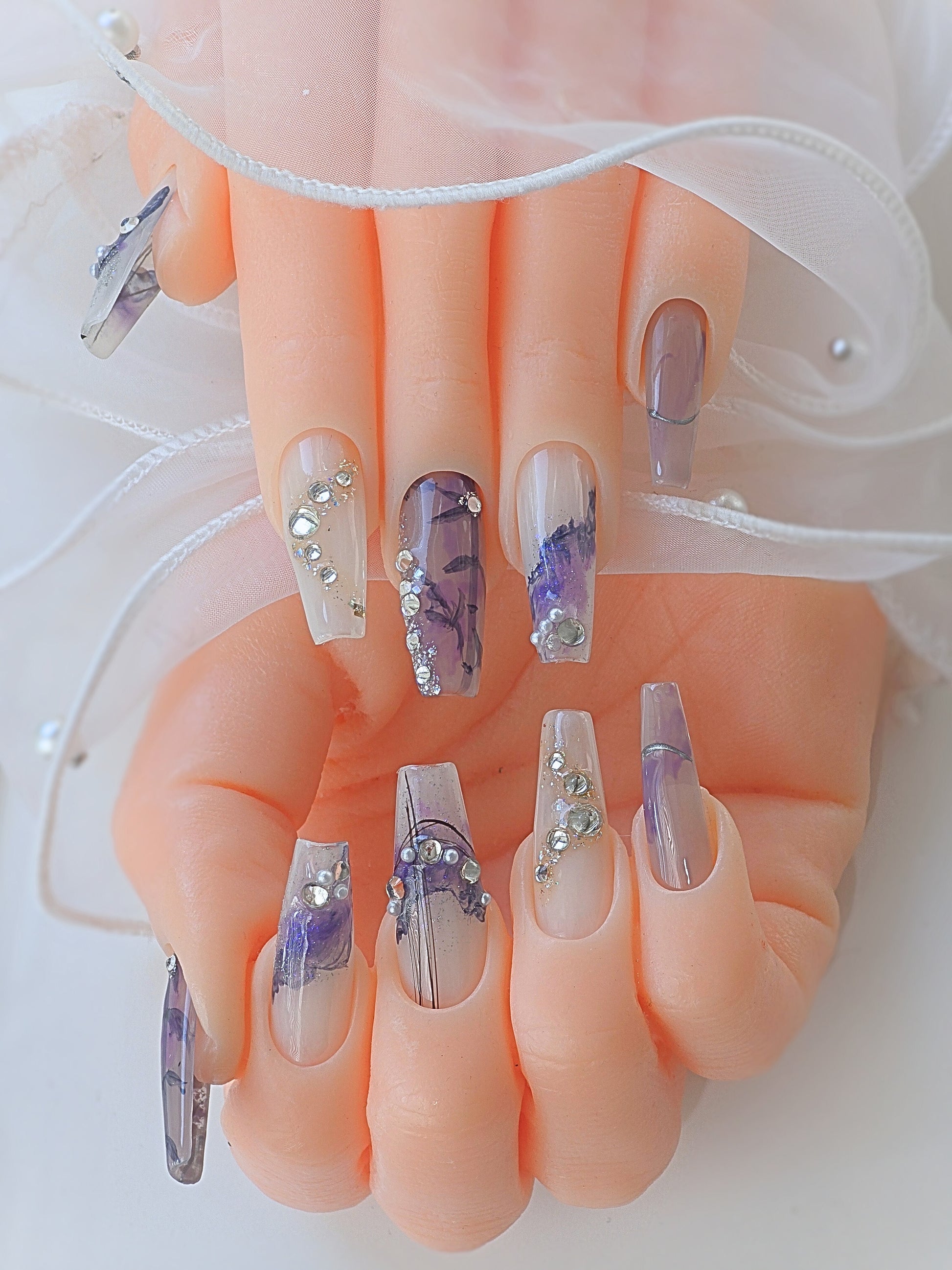Discover the beauty of Night Fall, a unique free style nail hand-drawn by our skilled artists. Comes in Long Coffin shape. Embrace the elegance of the night with every stroke of luxurious gems. Experience the highest quality nail salon service from our experts.