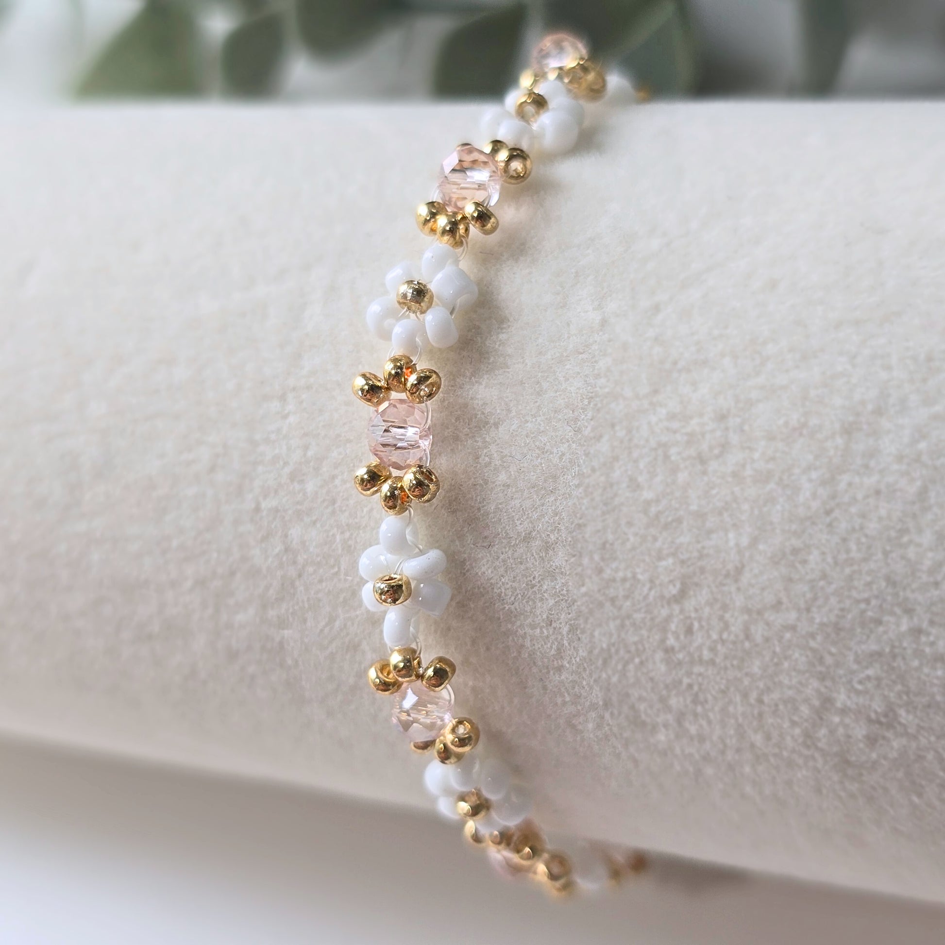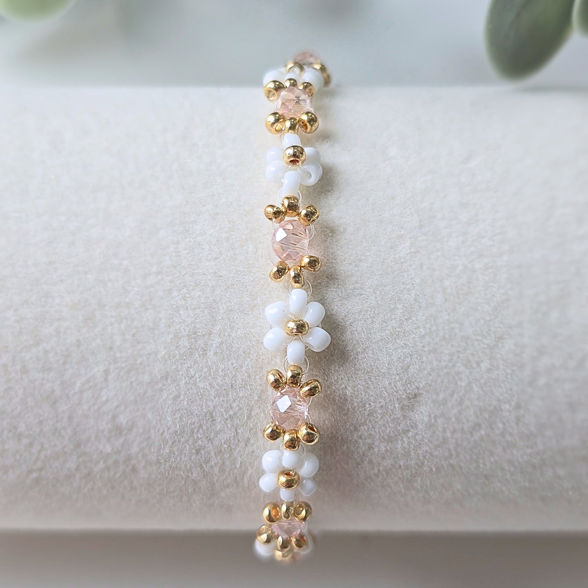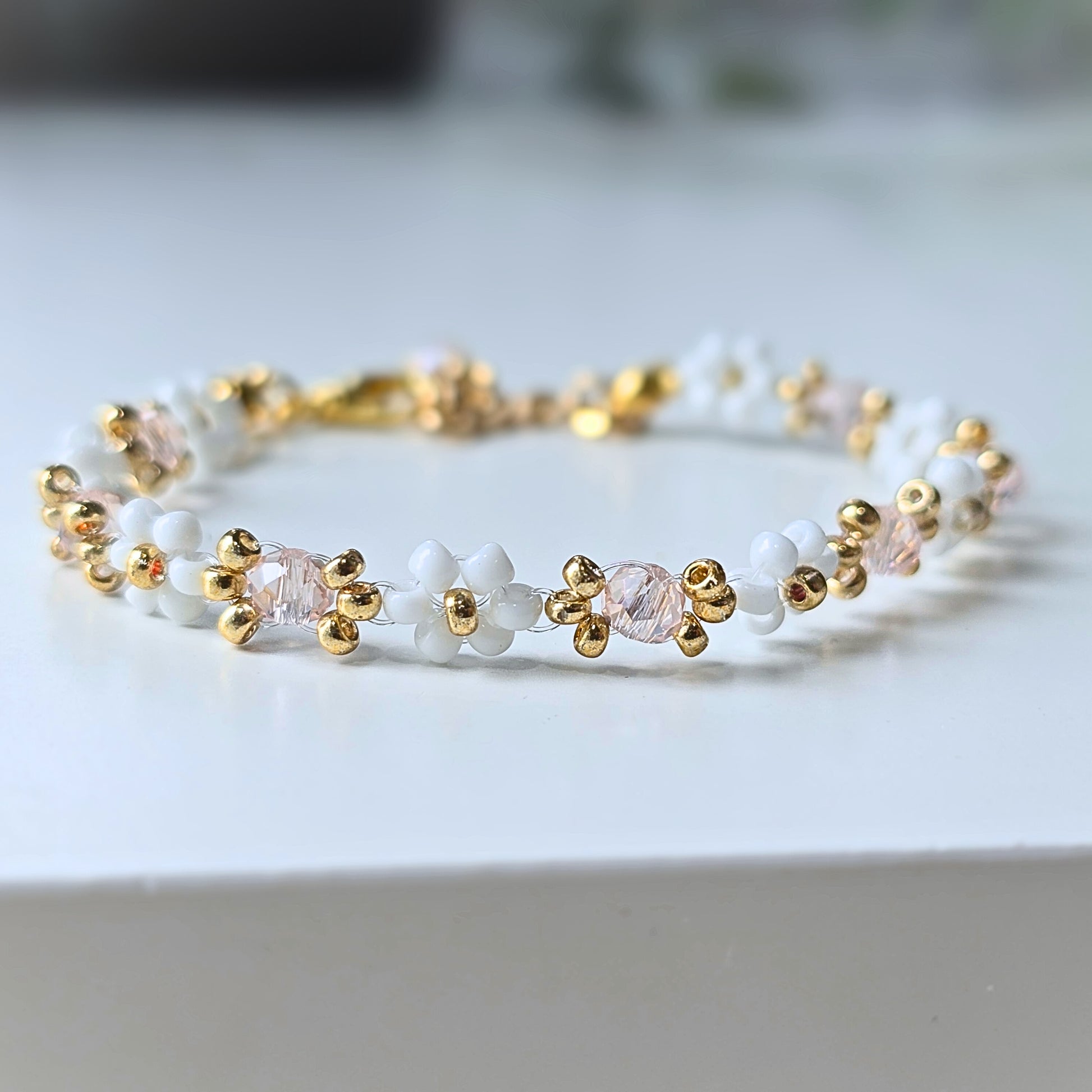 This Peony bracelet features white and pink crystal beads, giving it a cute and dainty appearance. With its delicate design, it is the perfect accessory for adding a touch of elegance to any outfit. The combination of white and pink adds a feminine touch, making it a great gift for any occasion.
